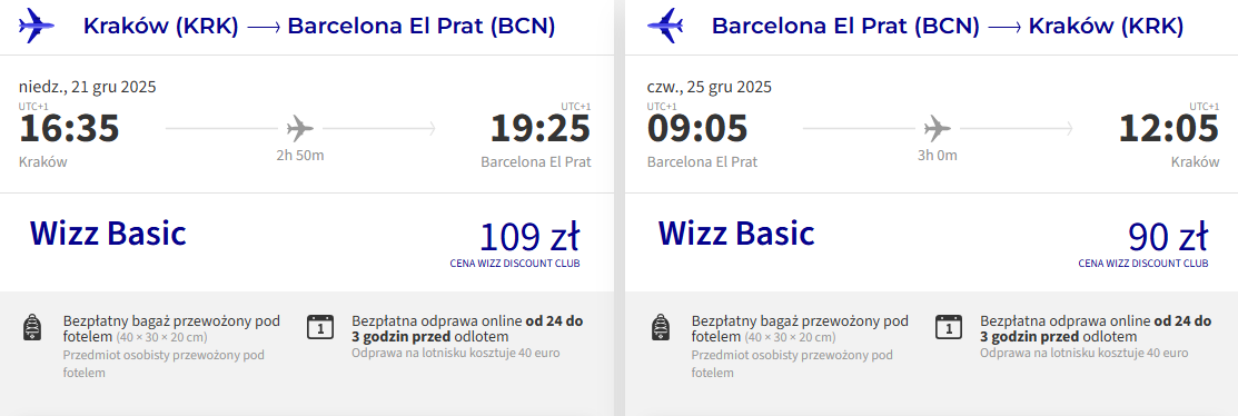 Do Barcelony polecisz z Krakowa w jednym z terminów obejmujących tegoroczne Święta Bożego Narodzenia. Do Hiszpanii polecisz bezpośrednio z Krakowa z Wizz Air. W cenie możesz zabrać bagaż podręczny, a najtańsze bilety kupią członkowie Wizz Discount Club (pozostałe osoby zapłacą nieco więcej).