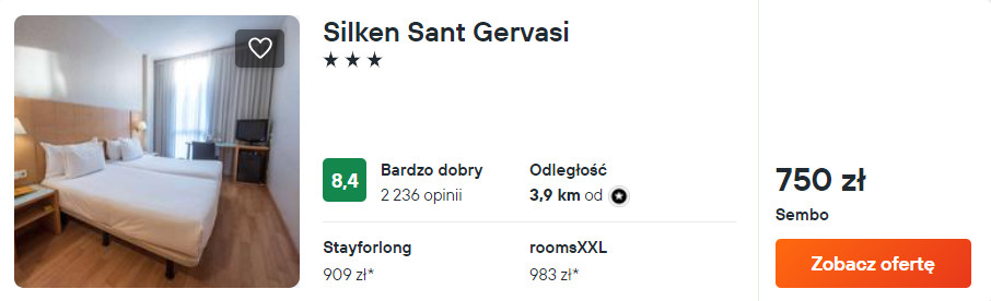 W Hiszpanii rekomenduję ci noclegi w 3* hotelu Silken Sant Gervasi. Każdy pokój wyposażony został w klimatyzację z funkcją ogrzewania, minibar, czajnik elektryczny oraz telewizor LCD. W łazience jest wanna z prysznicem i suszarka do włosów. Na terenie całego obiektu będziesz mieć zapewniony dostęp do sieci WiFi.