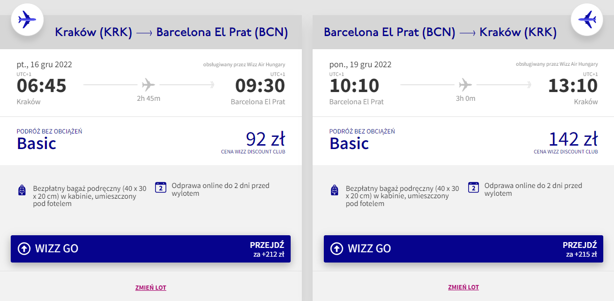 Na Półwysep Iberyjski udacie się w piątek 16 grudnia, z portu lotniczego Kraków-Balice. Do stolicy województwa małopolskiego wrócicie w poniedziałek (19 grudnia). W obie strony polecicie na pokładach samolotów linii Wizz Air. Bilety w najniższej cenie dostępne są dla osób z Wizz Discount Club. Chętni na loty bez WDC zapłacą więcej.