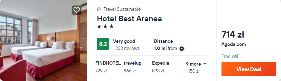 W Barcelonie zakwaterowani będziecie w 3* hotelu Best Aranea, który znajduje się w odległości 5 minut spacerem od kościoła Sagrada Familia. Z lotniska w okolice miejsca noclegowego dojedziecie komunikacją publiczną za ok. 30 PLN.