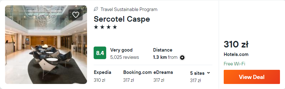 Niewiele więcej kosztować cię będzie pobyt w 4* hotelu Sercotel Caspe, który od stacji metra Arc de Triomf oddalony jest o 5 minut spokojnego spaceru. Na terenie obiektu znajduje się dobrze wyposażone centrum fitness. We wszystkich pomieszczeniach zapewniony będziesz mieć dostęp do sieci WiFi.