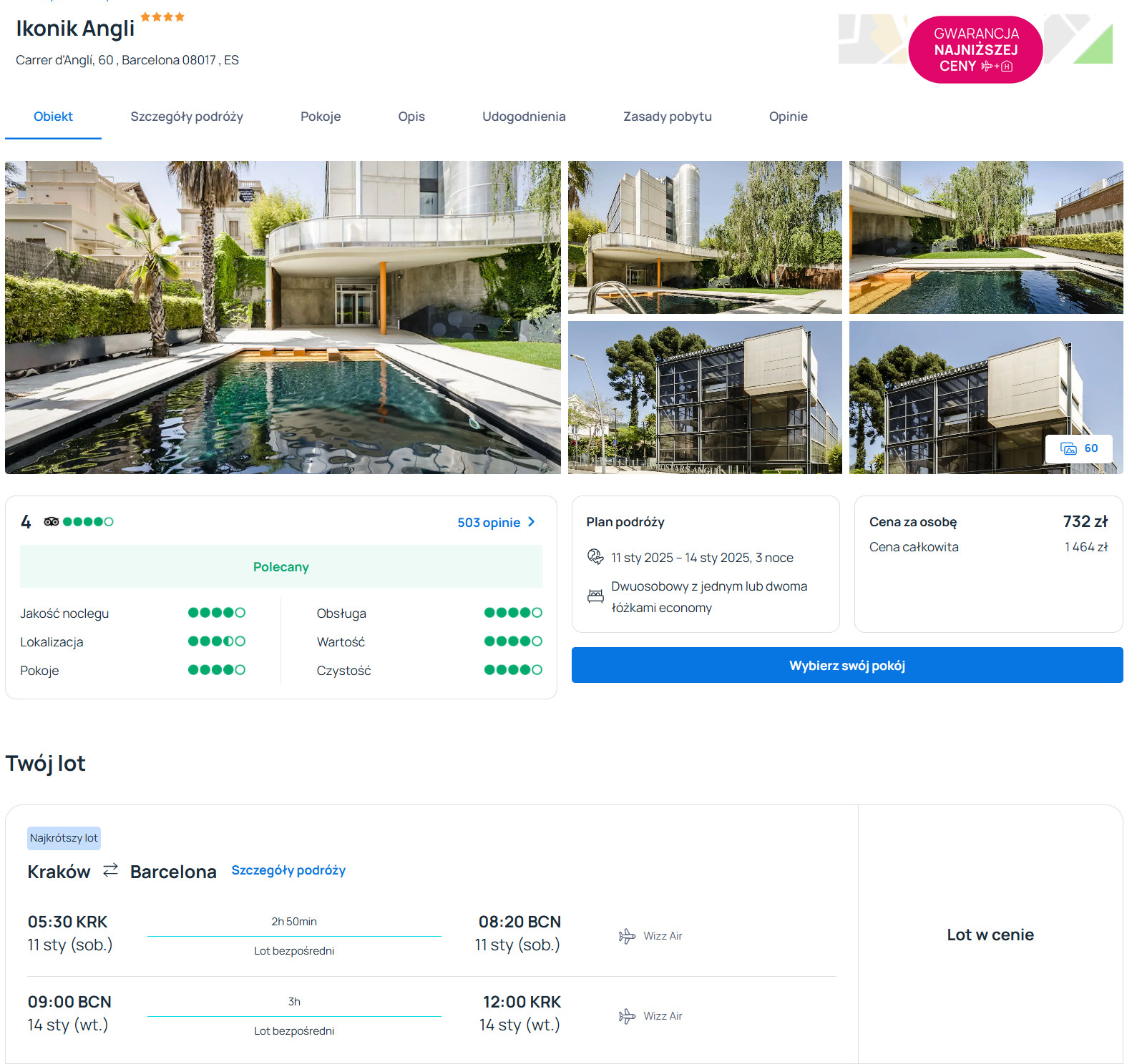 W stolicy Katalonii zatrzymasz się w bardzo dobrym 4* hotelu Ikonik Anglí, który znajduje się w spokojnej części miasta, nieopodal stacji Sarrià. Każdy pokój jest ogrzewany i wyposażony w telewizor LCD, minibar oraz czajnik elektryczny. W łazience jest prysznic, suszarka do włosów oraz podstawowe przybory toaletowe.