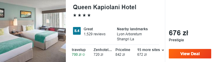 Na Hawajach zatrzymajcie się w 4* hotelu Queen Kapiolani. To świetnie oceniany obiekt, który zlokalizowany jest przy samej plaży Waikiki. Znajdziecie w nim siłownię i basen zewnętrzny.