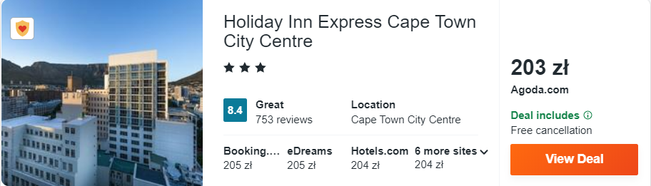 W Kapsztadzie polecam wam noclegi w 3* hotelu Holiday Inn Express Cape Town City Centre z tarasem widokowym na dachu, z którego podziwiać można Górę Stołową. Wszystkie pokoje wyposażone zostały w klimatyzację, sejf, zestaw do parzenia kawy i herbaty, telewizor LCD oraz lodówkę.