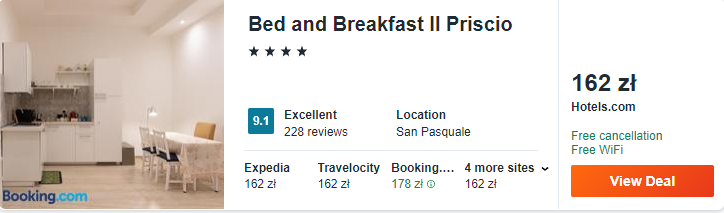 W Bari rekomenduję wam noclegi w 4* Bed and Breakfast Il Priscio. Obiekt zlokalizowany jest w samym centrum miasta. Ponadto jest rewelacyjnie oceniany przez gości.