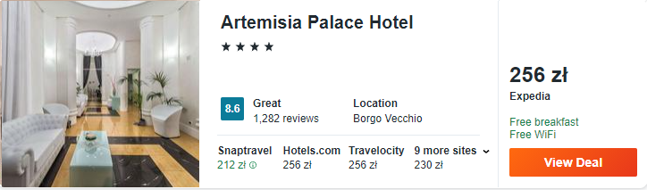 W Palermo zatrzymajcie się w 4* hotelu Artemisia Palace. W cenie zawarto śniadania i dostęp do Wi-Fi. Obiekt jest świetnie zlokalizowany, ponieważ do większości atrakcji będziecie mieć kilkaset metrów.