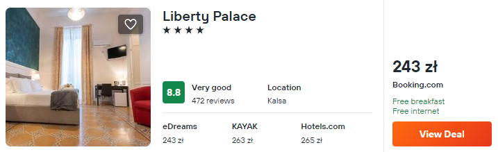 W Palermo rekomenduję wybrać zakwaterowanie w świetnie ocenianym 4* hotelu Liberty Palace. W cenę wliczono codzienne śniadania.
