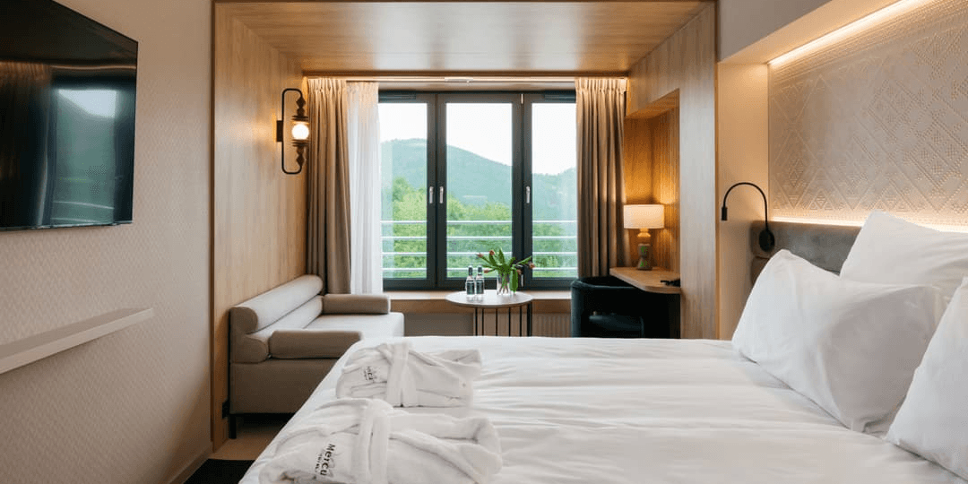 W cenie otrzymasz noclegi w komfortowo urządzonym pokoju oraz codzienne śniadania w formie bufetu z napojami. Pakiet obejmuje również 2-godzinny dzienny dostęp do kompleksu basenowego FLOW z brodzikiem dla dzieci, zjeżdżalniami, rwącą rzeką, jacuzzi wewnętrznym i zewnętrznym. Do dyspozycji gości jest także centrum fitness, sala zabaw dla dzieci oraz bezpłatne Wi-Fi. Hotel położony jest na wysokości 660 m n.p.m. z pięknym widokiem na beskidzkie szczyty.