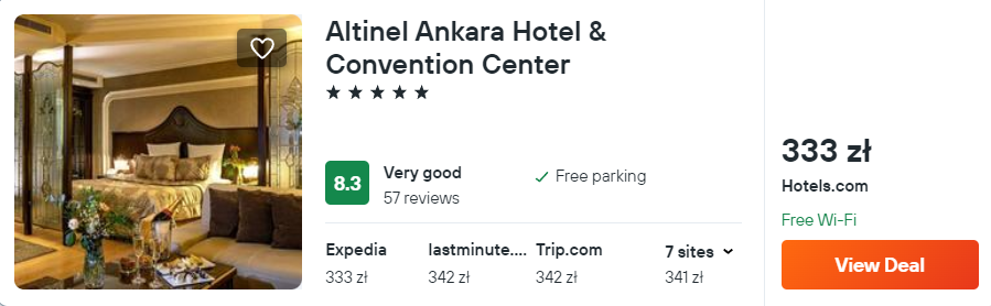 W Ankarze proponuję zakwaterowanie w 4* hotelu Grand Nora. Do twojej dyspozycji zostanie oddany nowocześnie urządzony pokój. W cenę noclegów wliczono śniadania.