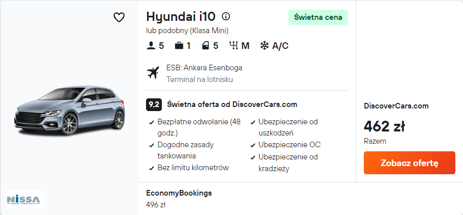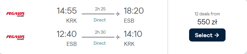 Do Ankary wybierzesz się w terminach między wrześniem a październikiem. Czeka cię lot na pokładzie samolotu linii lotniczej Pegasus Airlines, a bez dodatkowych opłat w podróż zabierzesz ze sobą bagaż podręczny. Dostępnych jest wiele dat (znajdziesz je w tekście poniżej), a najtańsze bilety zarezerwujesz już za 550 PLN.