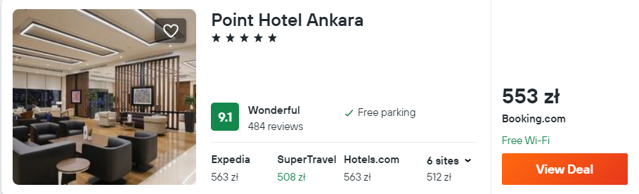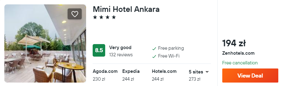 W Ankarze proponuję zakwaterowanie w 4* hotelu Mimi. Do twojej dyspozycji zostanie oddany nowocześnie urządzony pokój. Na terenie obiektu znajduje się strefa spa oraz restauracja.