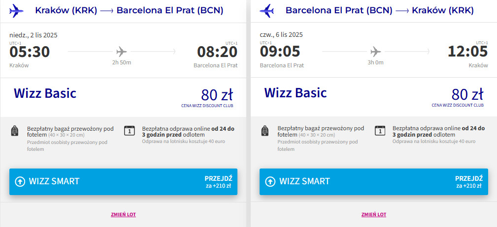 Do Barcelony polecisz bezpośrednio z Krakowalinią Wizz Air. Pamiętaj, że bilety w najniższej cenie dostępne są dla członków Wizz Discount Club. Chętni na loty bez WDC zapłacą 250 PLN (w obie strony).