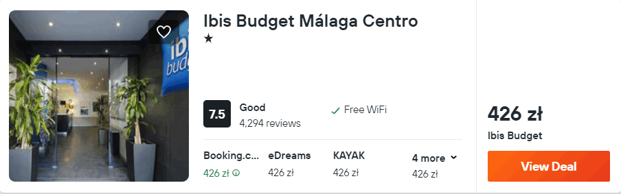 W Maladze rekomenduję ci noclegi w hotelu Ibis Budget Málaga Centro, który mieście się nieopodal Muzeum Picassa. Każdy pokój został wyposażony w klimatyzację oraz telewizor LCD. W łazience jest prysznic, suszarka do włosów oraz podstawowe przybory toaletowe.