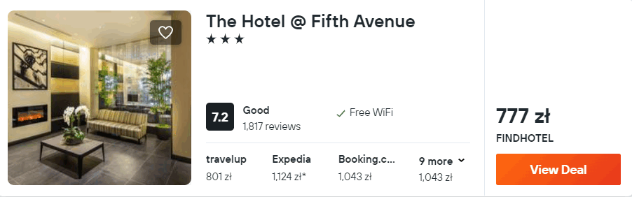 W Nowym Jorku proponuję ci noclegi w 3* The Hotel @ Fifth Avenue, który znajduje się zaledwie 500 metrów od znanego Empire State Building. Wszystkie pokoje wyposażone są w klimatyzację z funkcją ogrzewania. W każdym pokoju jest łazienka z wanną i prysznicem.