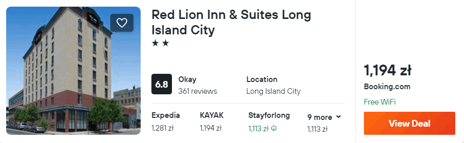 Możesz także zatrzymać się w hotelu Red Lion Inn & Suites Long Island City. Każdy pokój wyposażony jest w klimatyzację z funkcją ogrzewania, telewizor oraz zestaw do parzenia kawy lub herbaty. W łazience jest wanna z prysznicem, suszarka do włosów oraz podstawowe przybory toaletowe.