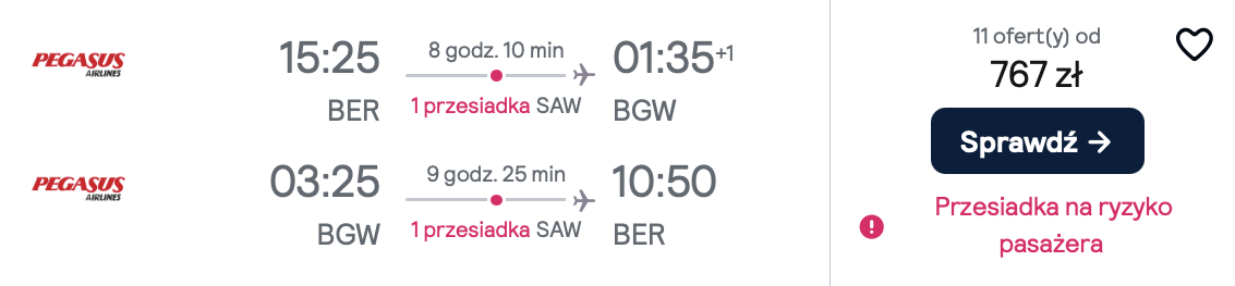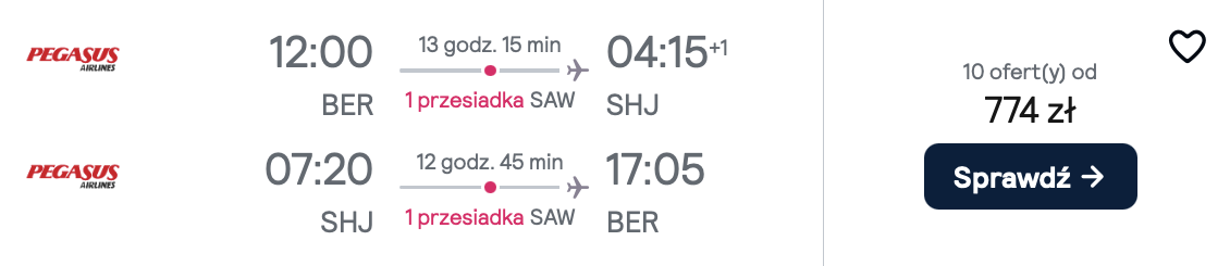 Poniżej znajdziesz propozycje wyjazdów do różnych miejsc w Azji Środkowej. Polecisz do nich z lotniska w Berlinie, linią Pegasus Airlines z przesiadką w Stambule. Najtańsze bilety zarezerwujesz już za 767 PLN. W cenę wliczony został bagaż podręczny.