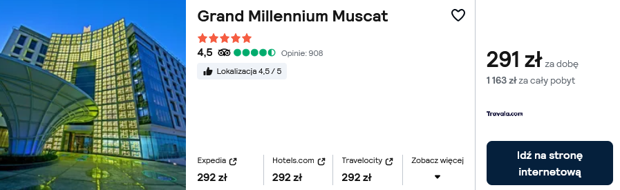 Natomiast w Omanie postaw na 5* hotel Grand Milennium. Ten luksusowy obiekt oferuje swoim gościom room między innymi dostęp do strefy spa siłowni oraz baru.