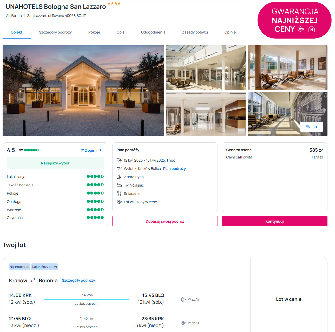 Zatrzymasz się w 4* hotelu UNAHOTELS Bologna San Lazzaro. Obiekt oferuje komfortowo urządzone, eleganckie wnętrza oraz codzienne śniadania. W pobliżu znajduje się przystanek komunikacji publicznej, który zapewnia sprawną komunikację z centrum miasta.