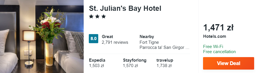 Na Malcie zatrzymacie się w miejscowości St. Julian’s, w bardzo dobrym 3* hotelu St. Julian’s Bay, który od najbliższej plaży oddalony jest o kilka minut spacerem. Z lotniska w okolice proponowanego przeze mnie hotelu dojedziecie autobusem X1 lub X2 za ok. 9 PLN.