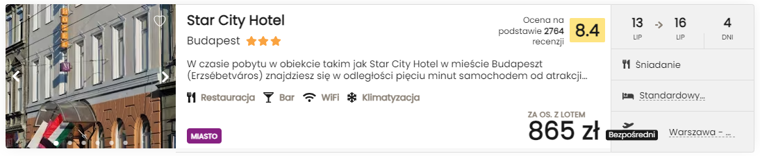 Będziesz zakwaterowany w 3* hotelu Star City. Na gości czekają komfortowo urządzone pokoje oraz codzienne śniadania. W bezpośrednim sąsiedztwie obiektu znajduje się przystanek autobusowy, który ułatwi nawigację po węgierskiej stolicy.