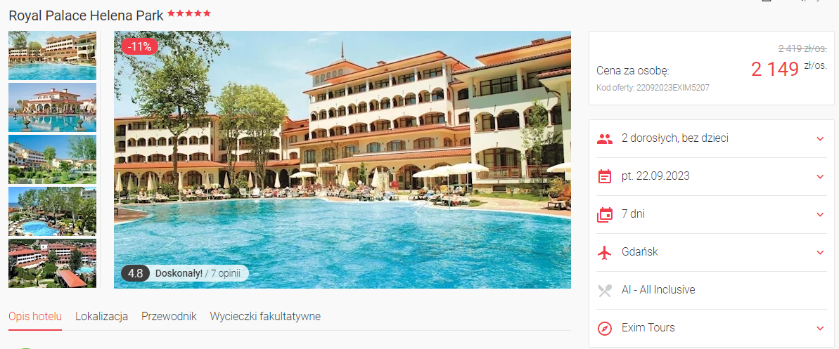 Spędzisz tydzień w bardzo dobrze ocenianym 5* hotelu Royal Palace Helana Park. To świetny obiekt wypoczynkowy, który spełni wymagania nawet najbardziej wymagających gości. Na miejscu będzie można skorzystać z basenu, zielonego ogrodu, tarasu słonecznego oraz centrum spa.