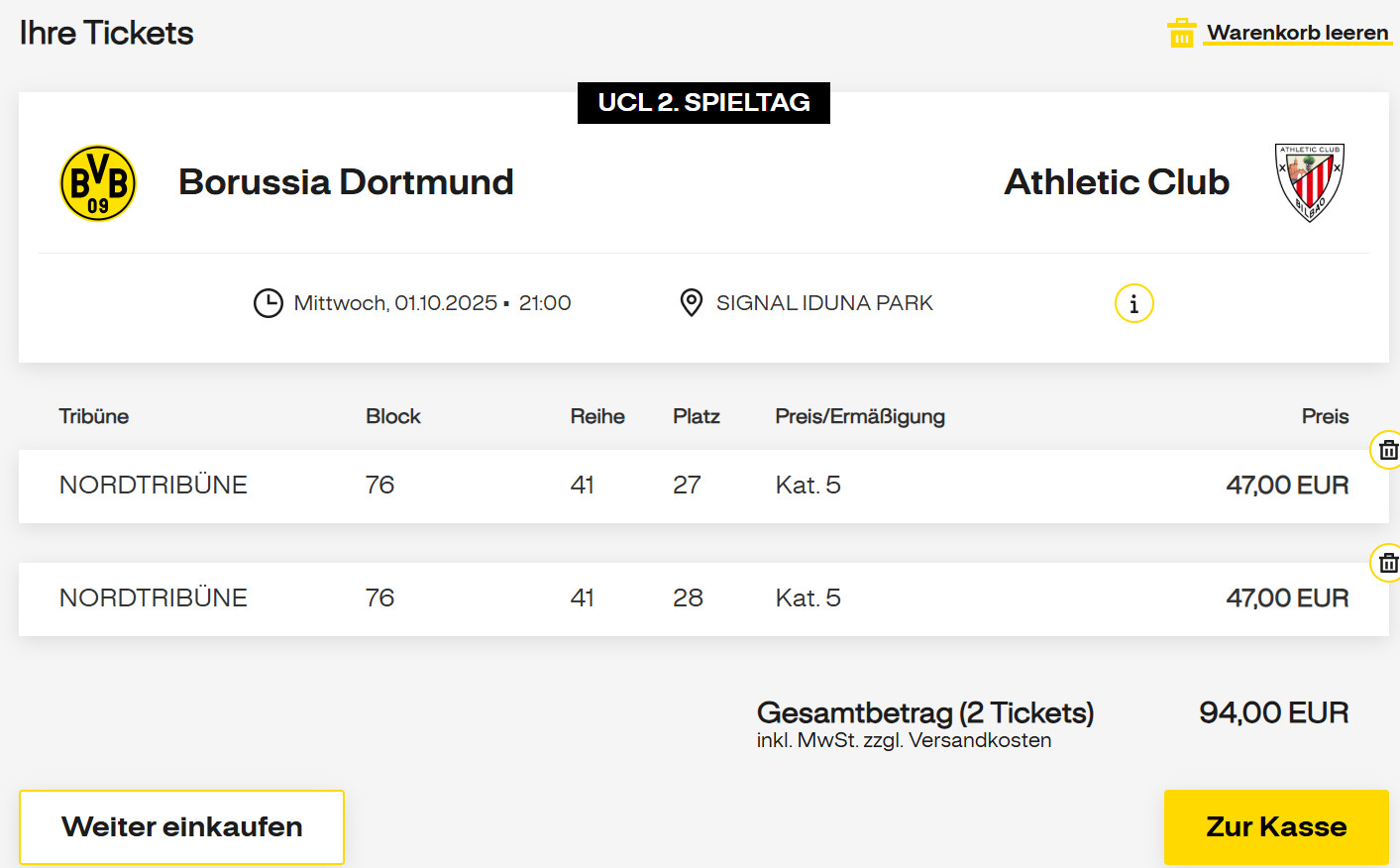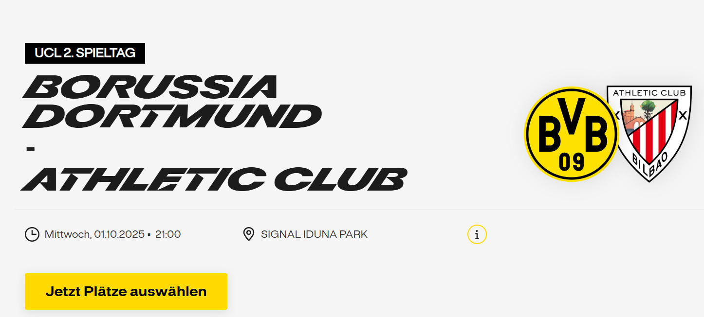 W pakiecie uwzględniłem także bilet na mecz Ligi Mistrzów: Borussia Dortmund-Athletic Bilbao, który odbędzie się w środę 1 października o godz. 21:00 na Signal Iduna Park. Zakup możliwy wyłącznie przez oficjalną stronę klubu bvb.de – wymagana jest bezpłatna rejestracja konta.