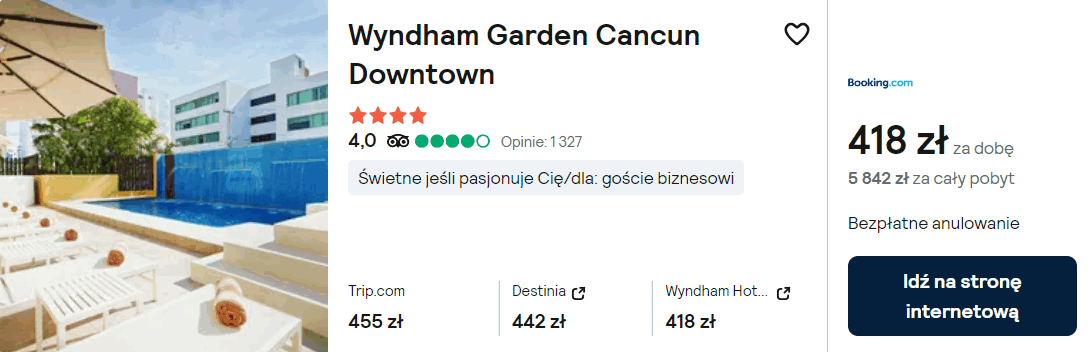 Natomiast w spokojnej części miasta możesz zatrzymać się w 4* hotelu Wyndham Garden Cancun Downtown. Na miejscu zapewniony będziesz miał dostęp do odkrytego basenu, centrum fitness oraz sieci WiFi.