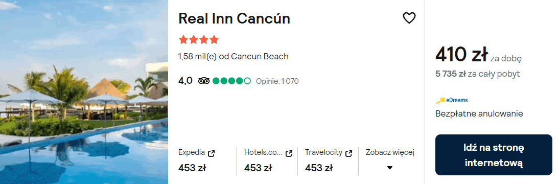 W wypoczynkowej części Cancun proponuję ci noclegi w 4* hotelu Real Inn z odkrytym basenem. Od plaży Tortuga jest on oddalony o 400 metrów.