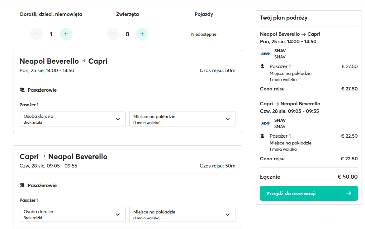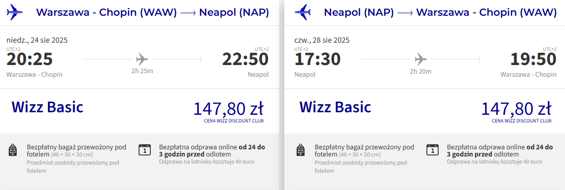 Do Włoch wybierzesz się w wakacyjnym szczycie sezonu, 24 – 28 sierpnia. Zacznij od zarezerwowania biletów z Warszawy do Neapolu. Do wyboru masz podróż z Wizz Air z lotniska im. Fryderyka Chopina lub z Ryanair z Modlina