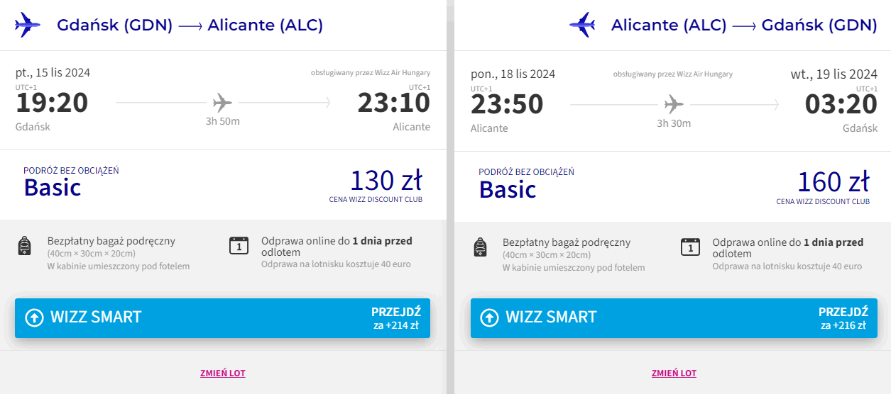 Na wybrzeże Costa Blanca udasz się z portu lotniczego im. Lecha Wałęsy w terminie 15-18 listopada (piątek-poniedziałek). W obie strony polecisz linią Wizz Air z bagażem podręcznym. Bilety w najniższej cenie dostępne są dla członków Wizz Discount Club. Chętni na loty bez WDC zapłacą więcej.