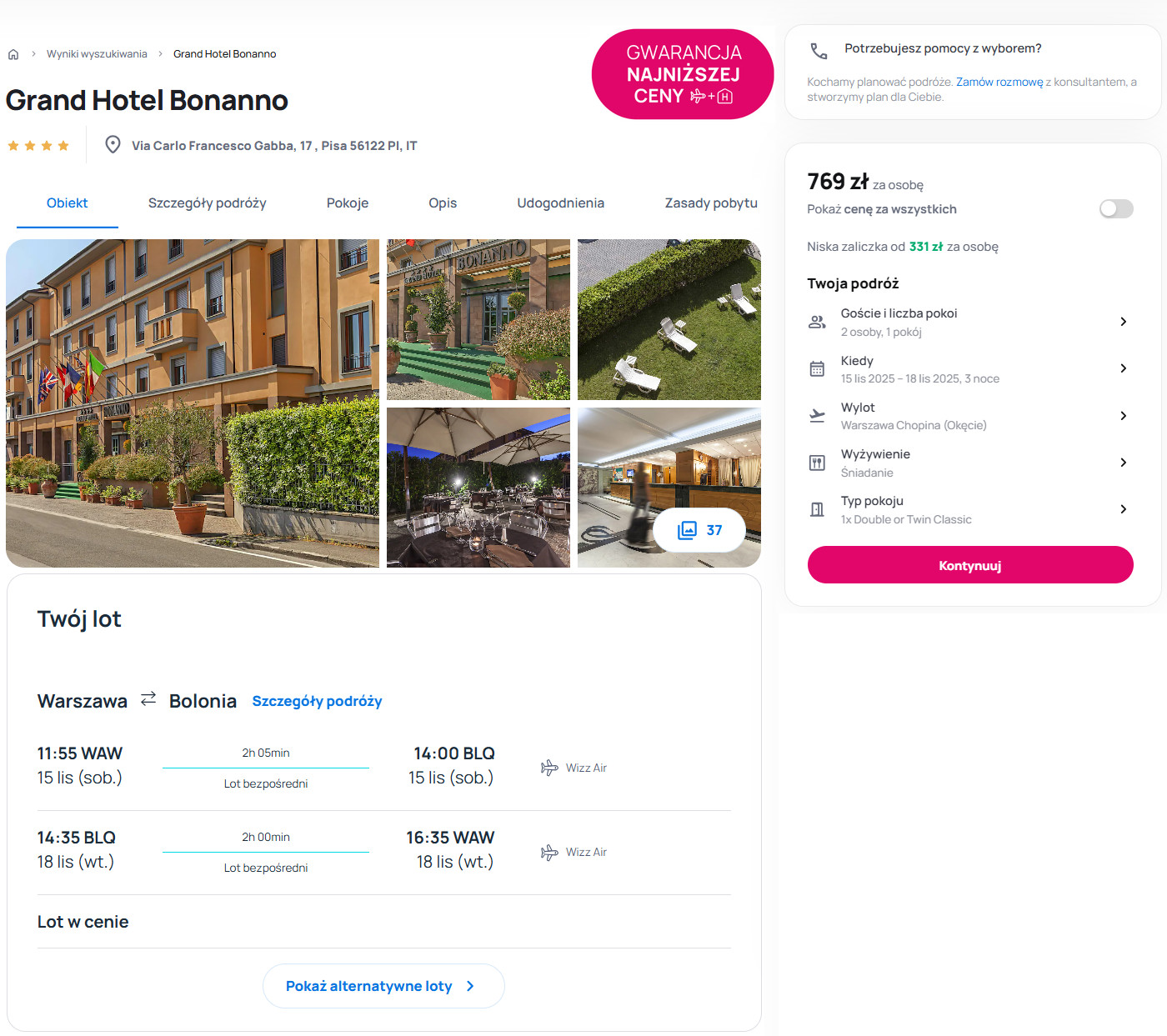 4* hotel Grand Bonanno w Pizie to świetne miejsce na pobyt od soboty do wtorku. Codziennie czekają tu pyszne śniadania w formie bufetu. Do Krzywej Wieży dojdziesz spacerem w ok. 10 minut, a dworzec kolejowy – z którego łatwo, tanio i szybko dojedziesz do Florencji – znajduje się zaledwie kilometr od hotelu.