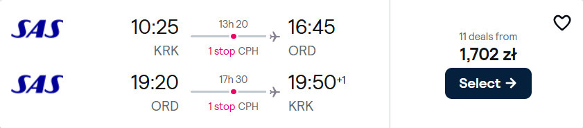 Do Chicago wybrać możesz się z Krakowa, Poznania, Warszawy oraz Wrocławia. Na każdej trasie polecisz linią SAS z przesiadkami w Kopenhadze. W cenie możesz zabrać ze sobą bagaż podręczny oraz przedmiot osobisty (mały plecak lub damską torebkę).