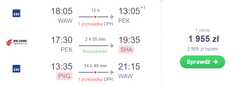Loty to kombinacja linii lotniczych SAS Airlines oraz Air China. Na ich pokłady będziecie mogli zabrać bagaż podręczny oraz rejestrowany. Lecąc linią SAS czekają was bardzo krótkie przesiadki w Kopenhadze (1 i 2 godzinne). Pomiędzy Pekinem a Szanghajem lecicie bezpośrednio.