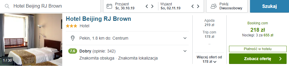 W Pekinie proponuję wam zatrzymać się w Hotel Beijing RJ Brown. Leży on w sercu miasta, 5 minut spacerem od Świątyni Nieba – jednej z najciekawszych atrakcji miasta. W jego ofercie znajdziecie nowoczesne pokoje z bezpłatnym dostępem do internetu. Każdy z nich wyposażony jest w klimatyzację, biurko oraz telewizor.