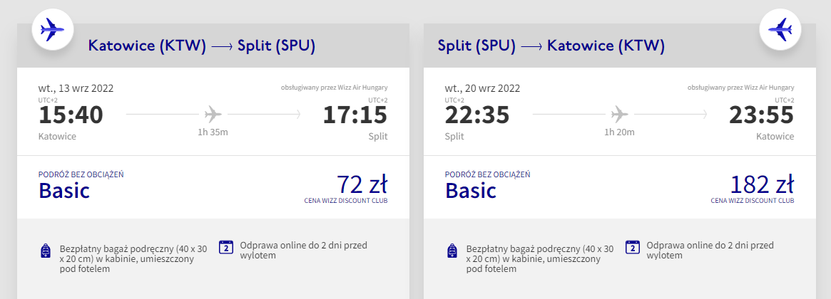Na Bałkany udacie się na zakończenie lata, w terminie 13 – 20 września. Czeka was bezpośredni lot z Katowic do Splitu, realizowany na pokładzie samolotu linii lotniczej Wizz Air. Bilety w najniższej cenie zakupią posiadacze Wizz Discount Club, pozostałe osoby zapłacą nieco więcej.
