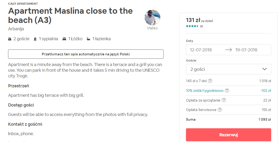 Zakwaterowanie w Apartment Maslina za 1093 PLN / 2 osoby / 7 nocy (547 PLN / osoba) W najniższej cenie polecą trzy osoby. Kolejne zarezerwują bilety 20 PLN drożej.