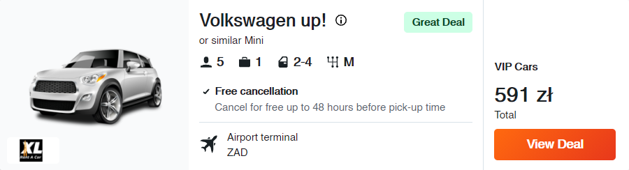 Zwiedzanie Chorwacji ułatwi wam wypożyczony samochód. Jest to najwygodniejszy sposób, aby dotrzeć do najgłębszych zakamarków okolic Zadaru. W przypadku tej podróży polecam wam samochód marki Volkswagen (model up! lub inne auto zbliżonej klasy).