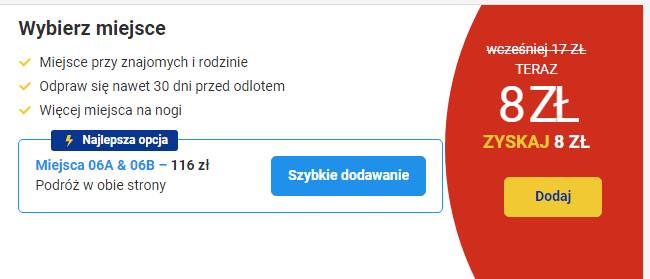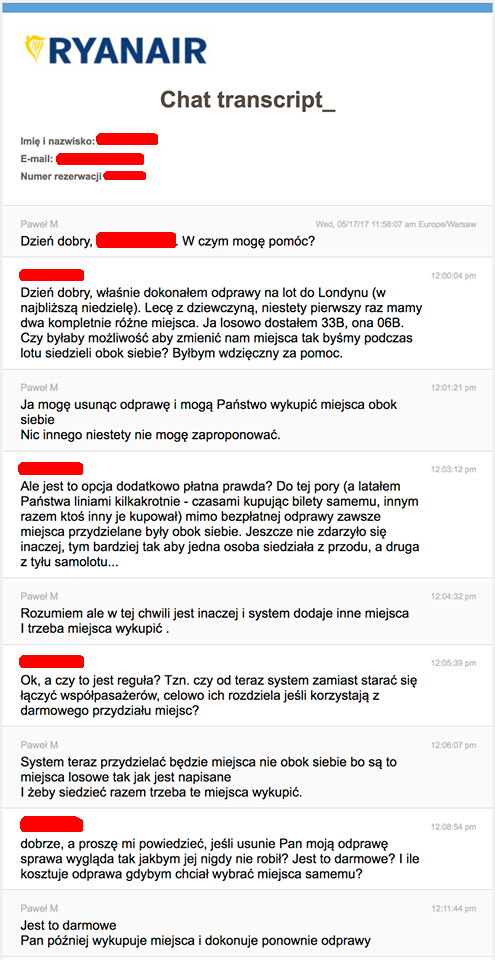 Skontaktował się z nami czytelnik, który kupił dla siebie i swojej towarzyszki bilet na połączenie z Warszawy-Modlin do Londynu-Stansted, w najbliższą niedzielę, 21. maja. Nie zdecydował się na wykupienie miejsc obok siebie, licząc że system nie rozrzuci ich po pokładzie. Niestety, zostało mu przydzielone miejsce z tyłu samolotu (33B), natomiast jego towarzyszka podróży otrzymała miejsce na samym przodzie (06B).