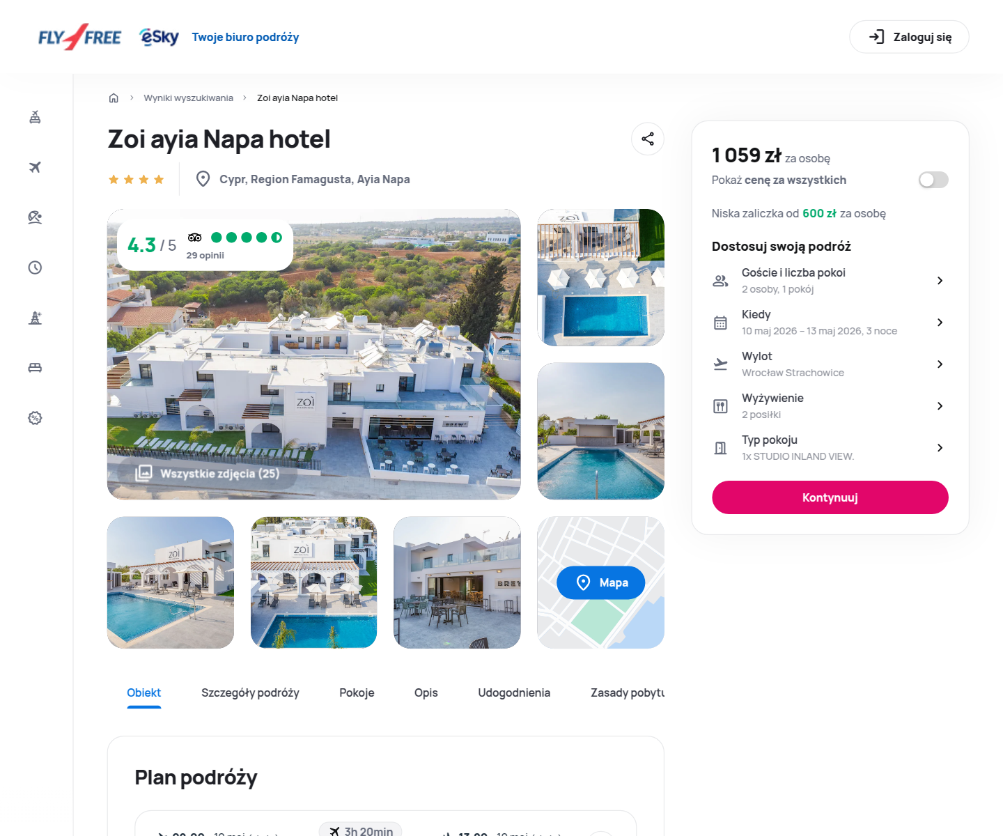 Zoi Ayia Napa Hotel położony jest w centrum Ajia Napy, zaledwie 4 minuty jazdy od słynnej plaży Nissi. Goście chwalą hotel za doskonałą lokalizację, pozwalającą na łatwe dotarcie do głównych atrakcji kurortu. Obiekt oferuje wygodny basen z leżakami, bar serwujący orzeźwiające drinki oraz restaurację z libańskimi specjałami. W cenie oferty otrzymasz przeloty, nocleg w 4* hotelu oraz dwa posiłki dziennie.