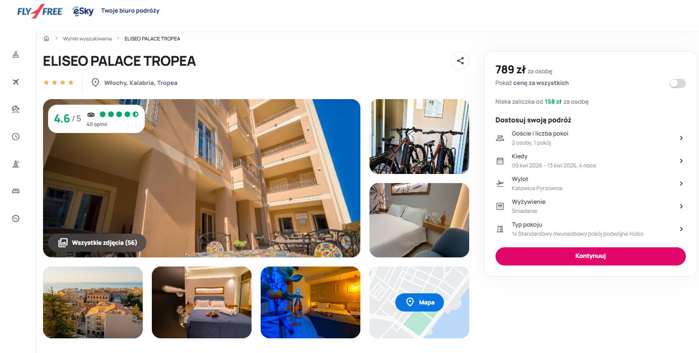 W Tropei zatrzymasz się w 4* hotelu Eliseo Palace. Goście szczególnie chwalą doskonałą lokalizację obiektu – zaledwie 400 metrów od plaży Spiaggia Le Roccette i 500 metrów od Spiaggia A Linguata. Hotel oferuje przestronne, klimatyzowane pokoje z widokiem na miasto oraz prywatną łazienką. Na dobry początek dnia otrzymasz tam pyszne śniadanie wliczone w cenę pobytu. Na miejscu znajduje się prywatny parking, zatem dobrym pomysłem będzie wynajęcie auta, którym dostaniesz się z lotniska w Reggio do Tropei.