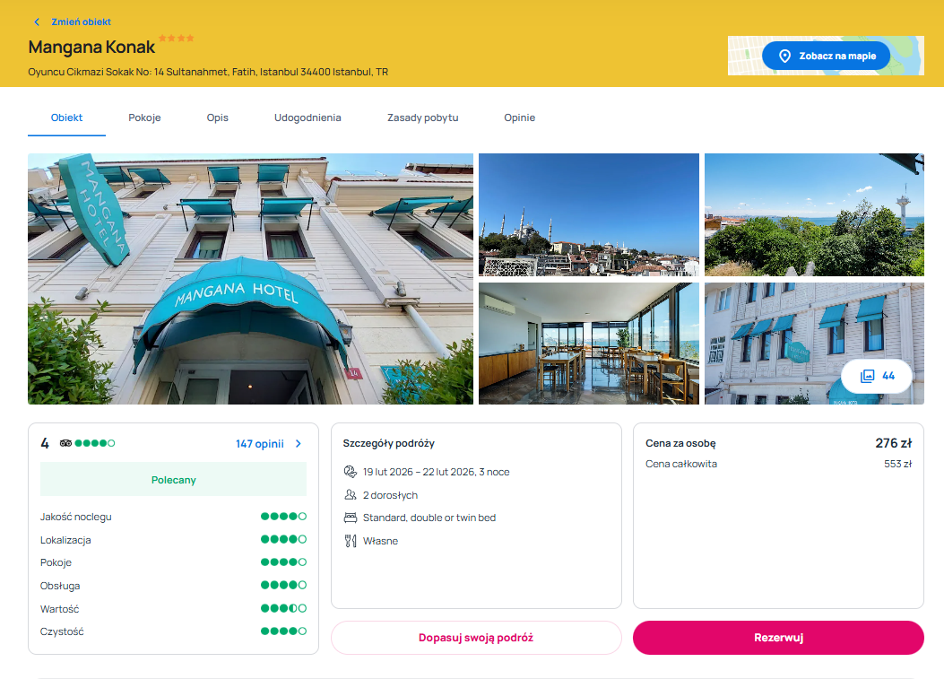 W Stambule rekomenduję bardzo dobrze oceniany 4* hotel Mangana Konak. Dotychczasowy goście doceniają przede wszystkim komfortowe pokoje oraz restaurację z pięknym widokiem.