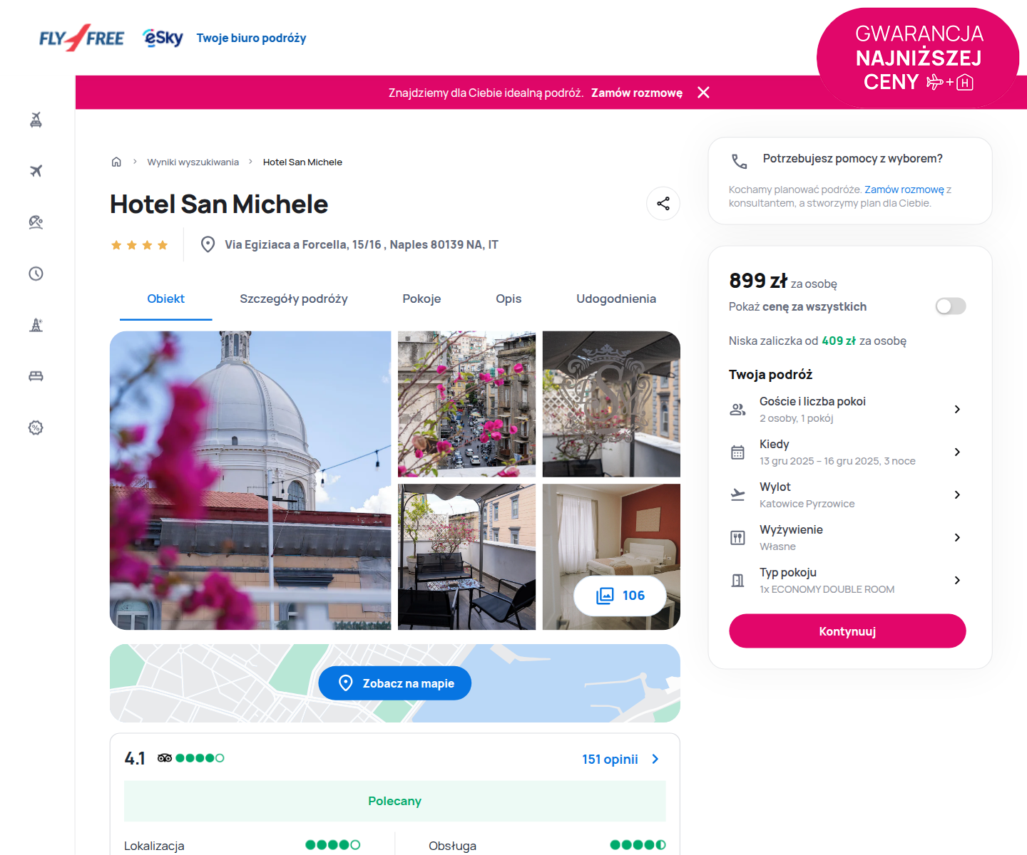 Na miejscu zatrzymasz się w 4* hotelu San Michele, który znajduje się w samym sercu historycznego Neapolu. Goście chwalą doskonałą lokalizację obiektu – zaledwie 5 minut spacerem od słynnej Via San Gregorio Armeno i Muzeum Kaplicy Sansevero. Hotel oferuje komfortowe pokoje z klimatyzacją, Smart TV i minibarem. Szczególnie doceniany jest taras na dachu z leżakami i pięknymi widokami na miasto.
