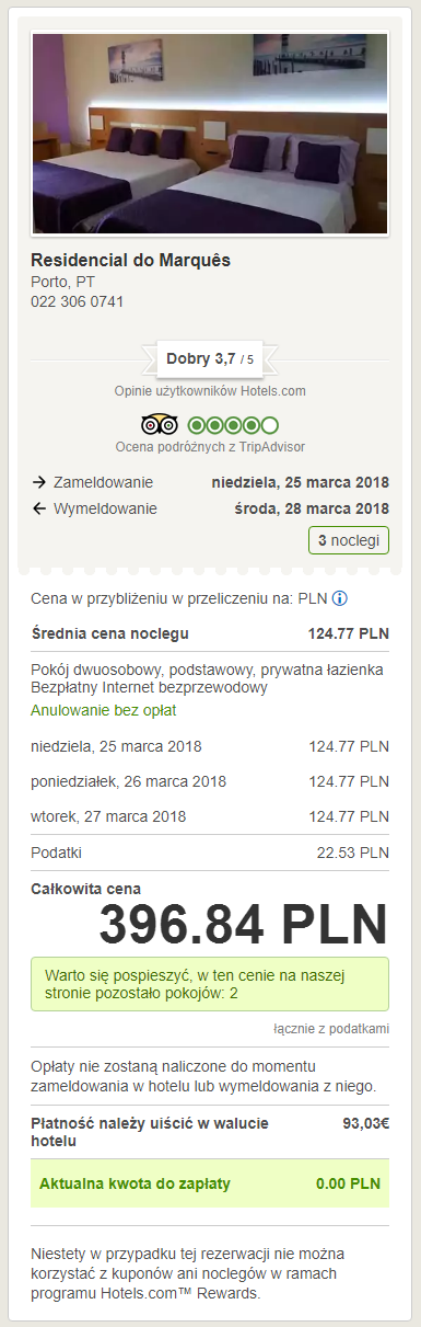 - Noclegi w hotelu hotelu 3* Residencial do Marquês za 397 PLN/2 osoby/3 noce (198,5 PLN/osoba)