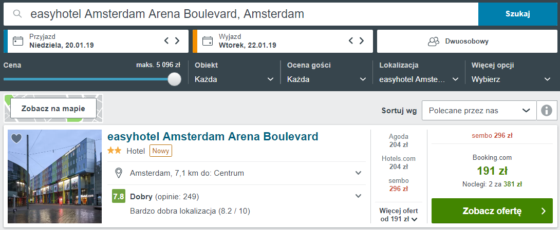 Zakwaterowanie w easyHotel Amsterdam Arena Boulevard za 395 PLN / 2 osoby / 2 noce (198 PLN / osoba) W podróż możecie zabrać ze sobą 1 sztukę bagażu podręcznego o wymiarach 55 x 40 x 25 cm i wadze nieprzekraczającej 10 kg.