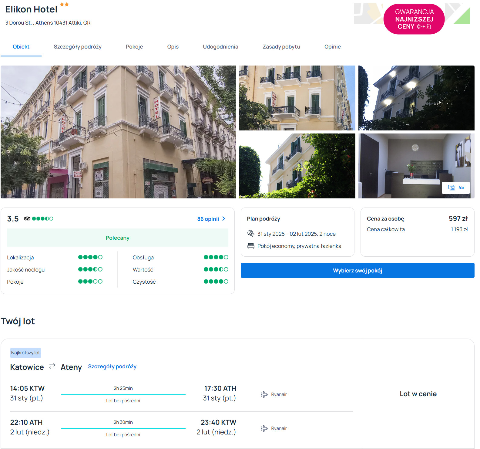 W stolicy Grecji zatrzymasz się w bardzo dobrym hotelu Elikon, który znajduje się nieopodal stacji metra Omonoia. Na terenie całego obiektu będziesz miał zapewniony dostęp do sieci WiFi. Każdy pokój jest ogrzewany i wyposażony w telewizor, lodówkę oraz czajnik elektryczny. W łazience jest prysznic, suszarka do włosów oraz podstawowe przybory toaletowe.