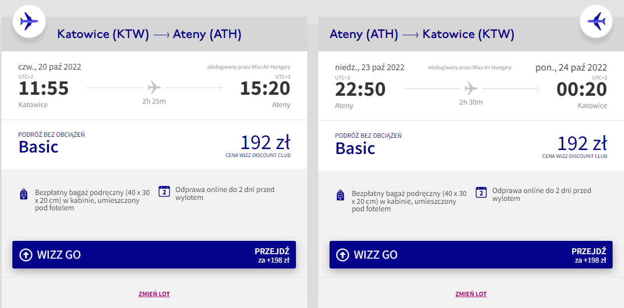 Do Aten udacie się w czwartek (20.10) z katowickiego lotniska w Pyrzowicach, a na Górny Śląsk wrócicie w niedzielę (23.10). W obie strony polecicie na pokładach samolotów linii lotniczej Wizz Air. Bilety w najniższej cenie dostępne są dla osób z Wizz Discount Club. Chętni na loty bez WDC zapłacą nieco więcej.