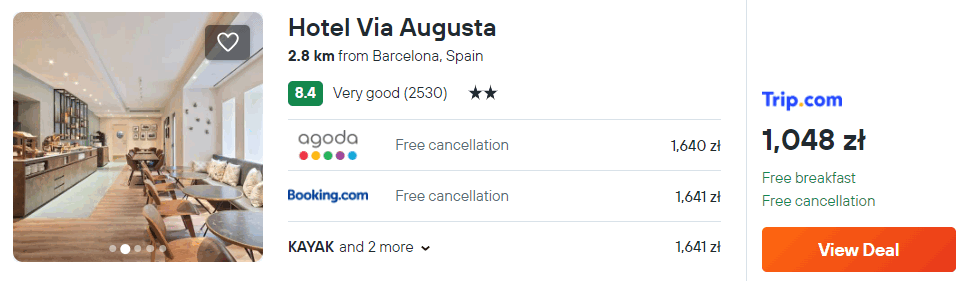 W Barcelonie rekomenduję ci noclegi z codziennymi śniadaniami w hotelu Via Augusta. Na jego dachu mieści się taras widokowy, z którego rozpościera się malowniczy widok na miasto. W każdym pokoju jest łazienka z wanną.