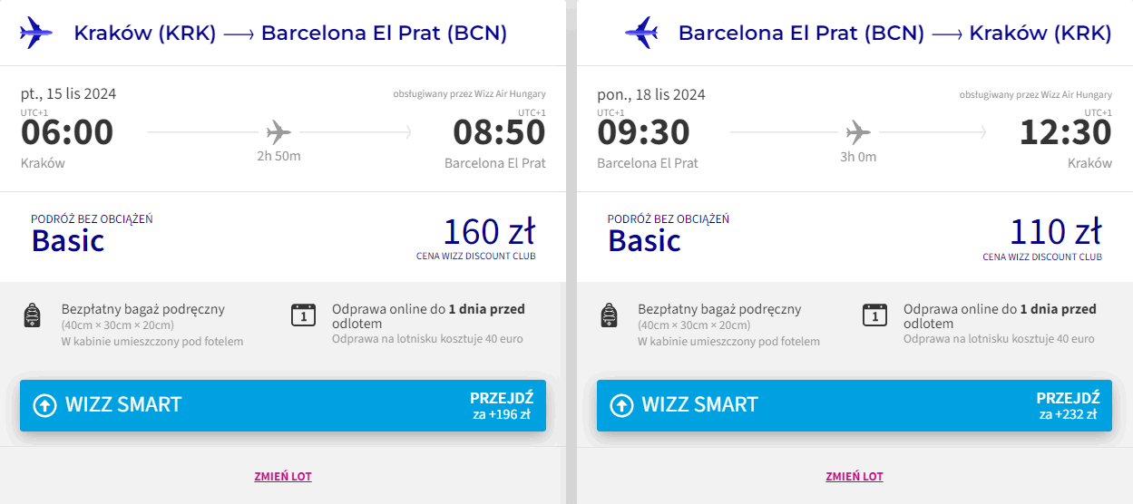Do stolicy Katalonii udasz się portu lotniczego Kraków-Balice w terminie 15-18 listopada (piątek-poniedziałek). W obie strony polecisz linią Wizz Air z bagażem podręcznym. Bilety w najniższej cenie dostępne są dla członków Wizz Discount Club. Chętni na loty bez WDC zapłacą więcej.