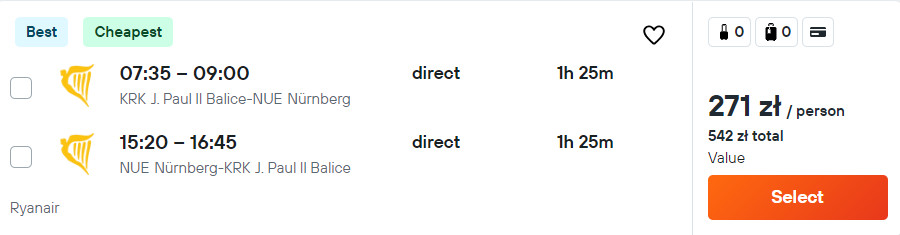 Do Norymbergi udasz się z krakowskiego lotniska w Balicach w terminie 3-5 listopada (piątek-niedziela). W obie strony polecisz na pokładzie samolotu linii Ryanair z wliczonym małym bagażem podręcznym.