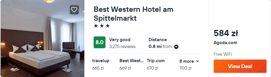W stolicy Niemiec zakwaterowani będziecie w 3* hotelu Best Western am Spittelmarkt, który znajduje się w sąsiedztwie stacji metra o tej samej nazwie (Spittelmarkt). Z lotniska w okolice miejsca noclegowego dostaniecie się komunikacją publiczną – więcej informacji na temat dojazdu do centrum miasta, znajdziecie w tym wątku na forum.